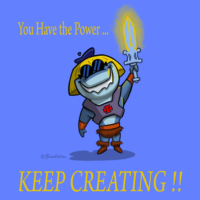 This is ArtShark. He's the Academy's mascot. I've been drawing him for over 26 years. Here he is dressed like He-Man with a message for everyone. This is his mission. To spread a word of positivity and encouragement to artists everywhere.